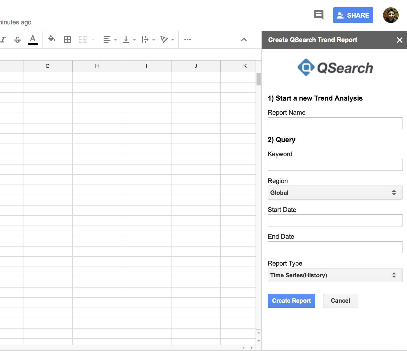 QSearch Trend for Google Spreadsheet 方便您做社群分析趨勢報告,關鍵字輸入方式與原本系統上無異。