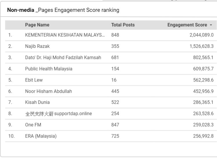 再看馬來西亞,除了排名第二的前首相納吉,第四名的衛生部,其餘排名前30的非媒體類粉絲頁,同樣以宗教人物或媒體人為主,例如宗教司Ebit Lew。