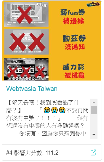 就整體聲量而言,客家券是四種券中討論聲量最低的,也沒有太多的起伏。反之,動滋券則同藝Fun券,消息出來後就熱度持續,到最後抽籤開獎時更是直逼藝Fun券的單日聲量。整體觀看四種券的聲量比較,藝Fun券最受關注;農遊券與動滋券整體相若,但單日聲量動茲券較高;而客家券的社群影響與關注度則是最低。