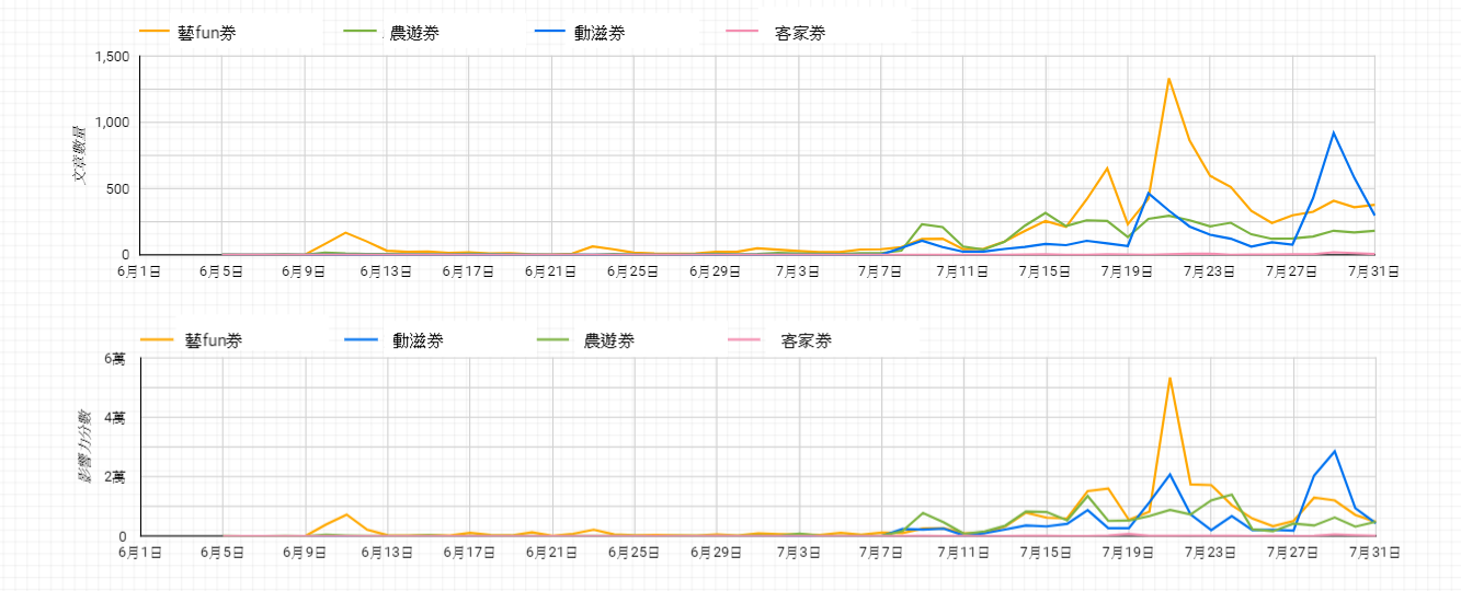 可以發現最早開始在社群上有消息的農遊券,關注度一直不高,直到開放登記時討論量才高升。藝Fun券則是第二個推出,在 6 月 10 日消息出來後,聲量多數都保持在高點。到開獎日時,討論聲量更是飆到最高點。