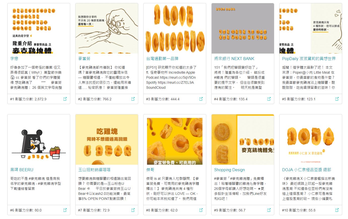 麥克鷄塊體這波就算單看 Facebook、Instagram 上的數據,總計也有超過 250 個品牌參與共創、超過 5 萬個讚或愛心、超過 3 千次分享、2 千多則留言,再加上18則媒體類網站的討論或報導,在僅不到一個月的時間內算得上是頗具聲量的社群行銷事件。