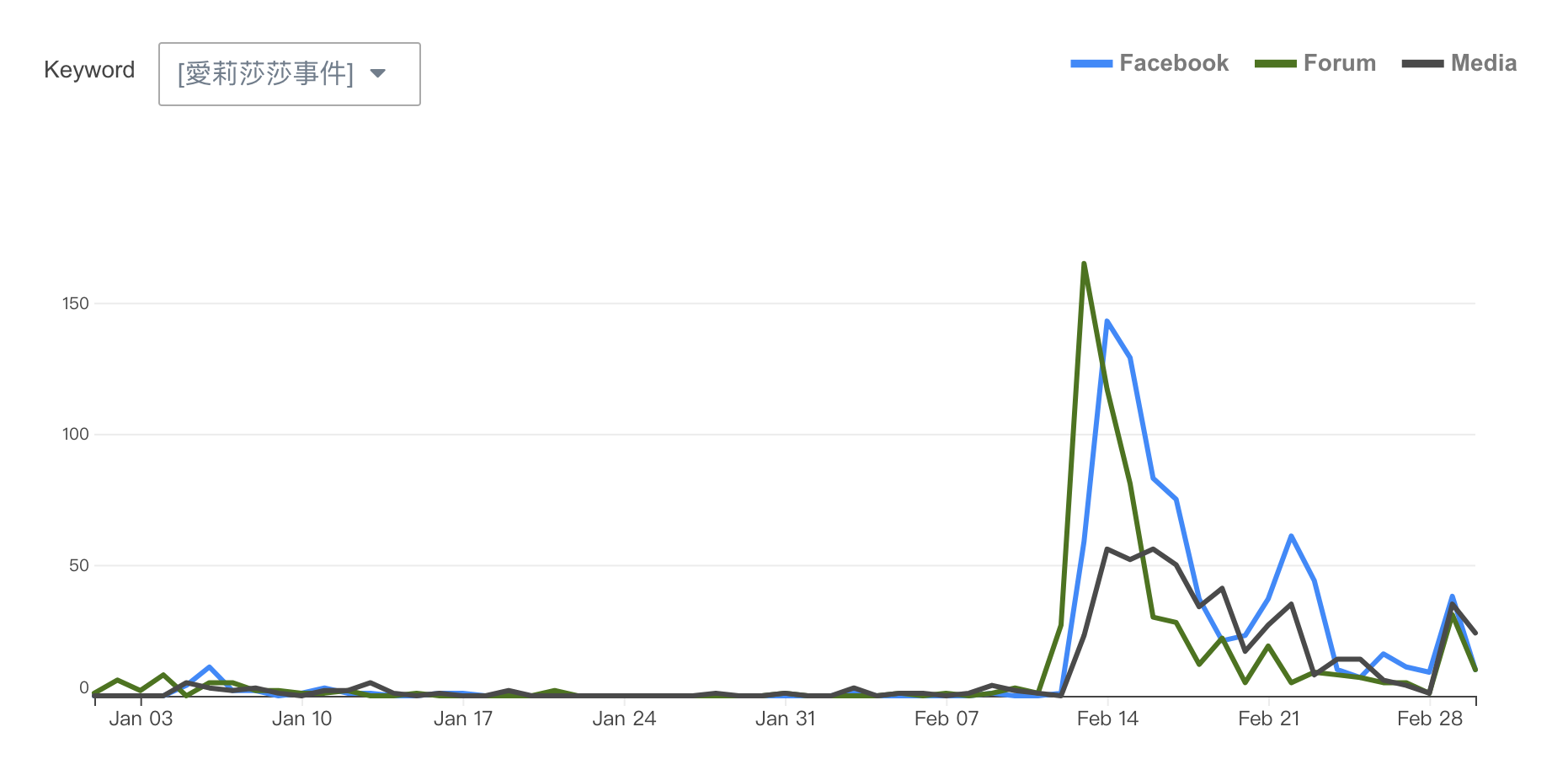 2/14 愛莉莎莎在深夜發布了道歉影片,當天則在 Facebook 與媒體上到達討論的高峰,不過在道歉影片發布後,網友們對於此事件的關注就減緩了不少,僅剩媒體在往後幾天持續在報導。
