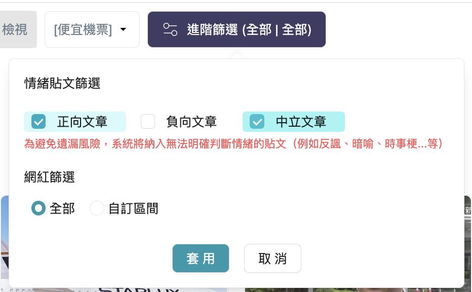 當你選擇「排除某一種情緒」的組合時,系統會自動納入無法明確判斷情緒的貼文,並顯示說明提示。
