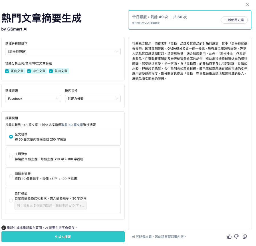 - 單次摘要最多擷取前 50 篇文章進行分析